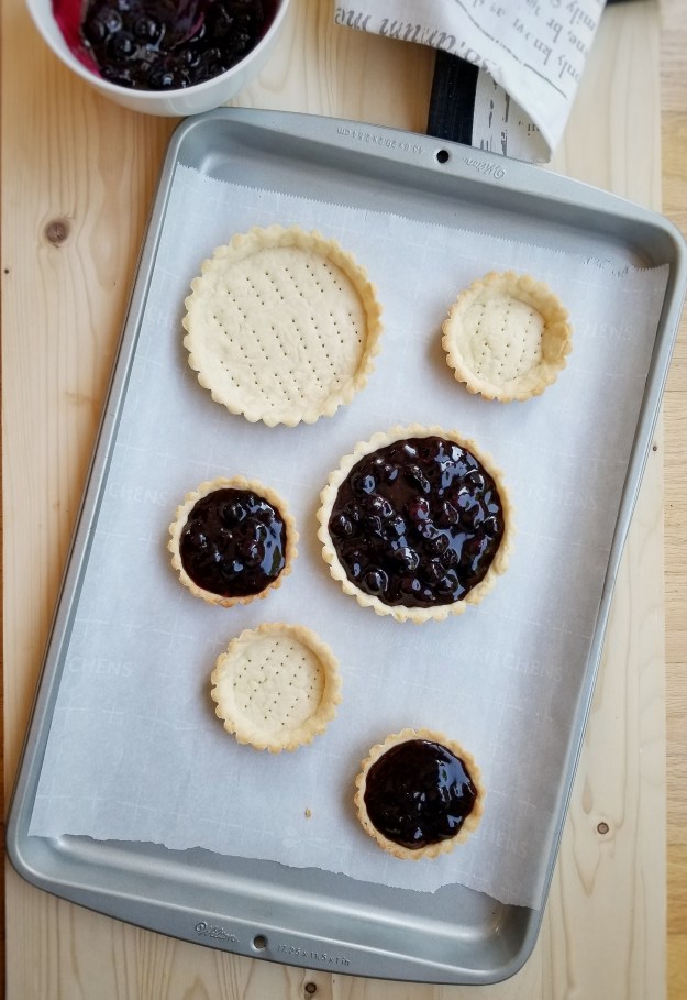 How can I not make something out of blueberries in the summer! We are so lucky to have some locally grown blueberries and I would buy at least 20 lbs of them! This is a super easy recipe. You can make the tart dough ahead of time and freeze it until use. Try to spoon the fillings in just before serving so the tart shells won’t get soggy.