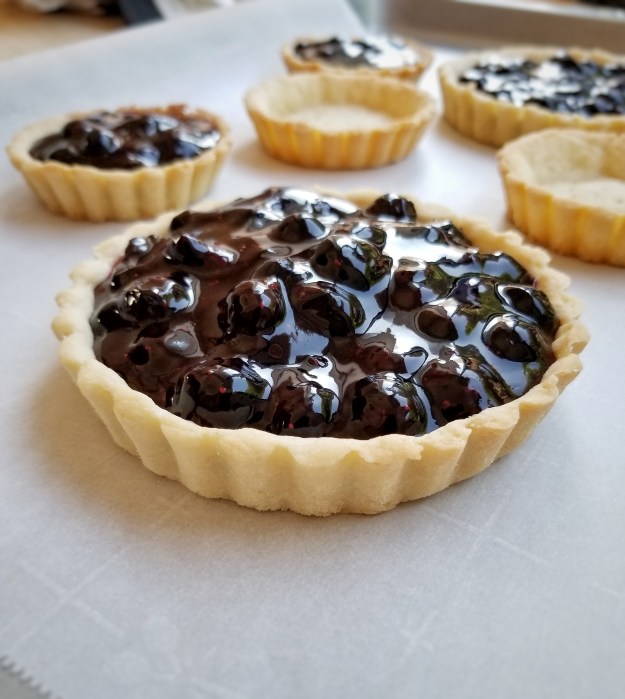 Right before serving, spoon blueberry fillings into cooled tart shells