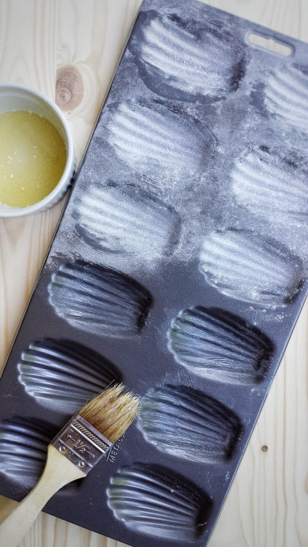 - When ready to bake, prepare madeleine pan by melting about 30 g of butter in a sauce pan or microwave, cool slightly