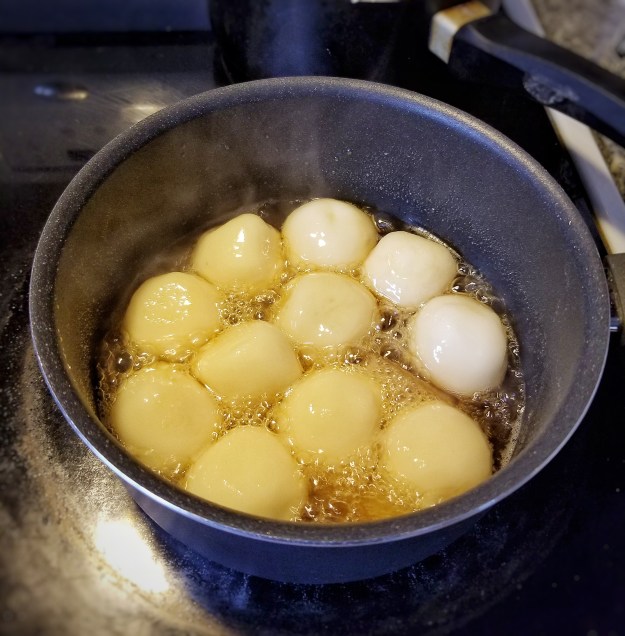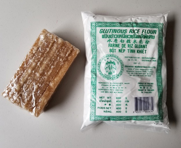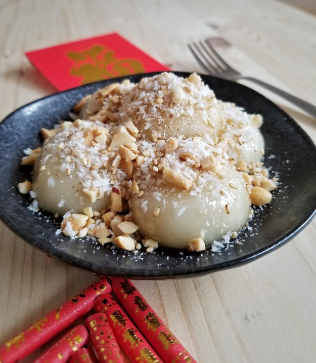 My fondest memory of Chinese New Year is definitely the food ! Rice cake, turnip cake, dumplings…..and many more ! I used to eat these sticky rice balls every year when I visited my aunt. The Chinese name of this dessert is 糖不甩 (pronounced as “tong but lut”), which literally means “sugar doesn’t come off”. What an interesting but appropriate name ! These balls are soft, chewy, with some sweet and crunchy toppings……just bites of yumminess ! Most of the ingredients are easily accessible in Asian supermarkets. The Chinese brown sugar for the syrup usually comes in a pack of 5-6 sticks. If you cannot find it, regular brown sugar would work too but use a little less, I tried and found it sweeter than the Chinese kind.