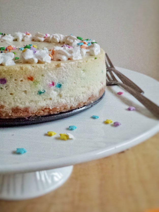 Here is a fun cake to make for New Year ! Funfetti Cheesecake ! I added some rainbow sprinkles to a basic cheesecake recipe and used shortbread cookies for the crust. I baked the cheesecake in a hot water bath to prevent the cake from cracking….Hope you’ll enjoy it and have a fun New Year !