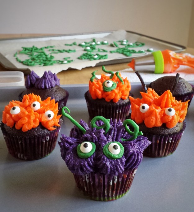 Me? I am just going to make monster cupcakes ! These chocolate cupcakes with vanilla butter cream taste really yummy and are not scary at all ! They actually look quite adorable ! Happy Halloween !