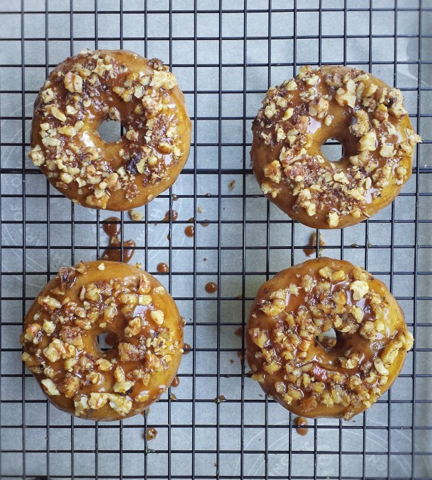 - To assemble, dip one side of doughnuts into the glaze, then the crushed walnuts, best to serve immediately