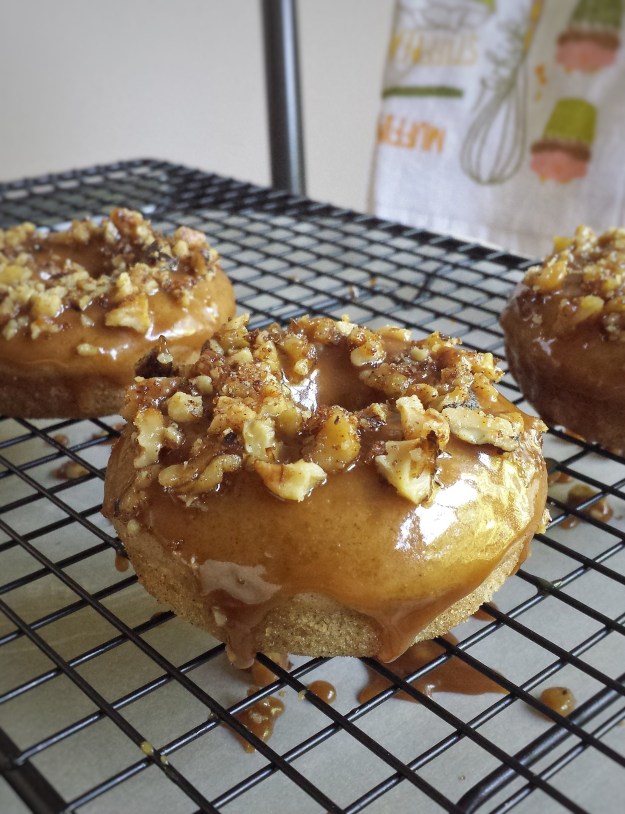 Since the kids are back to school, I finally have a little more time to work on my recipes. These cinnamon doughnuts are nice surprise ! I was trying to make some cinnamon apple waffles but they didn’t turn out right. So, I switched and made doughnuts instead. And I am so glad I did ! They are so soft and tasty even without any toppings. But hey, why not kick them up 2 more notches ! The butterscotch glaze is heavenly ! No kidding, my daughter would have “drunk” the whole bowl if I didn’t stop her ! The toasted walnuts are really nice too, they add extra flavour and crunchiness. Pecans would also be a good alternative. You can refrigerate the extra butterscotch sauce for up to 1 week. Rewarm and drizzle it on some vanilla ice cream, and you’ll have another dessert !