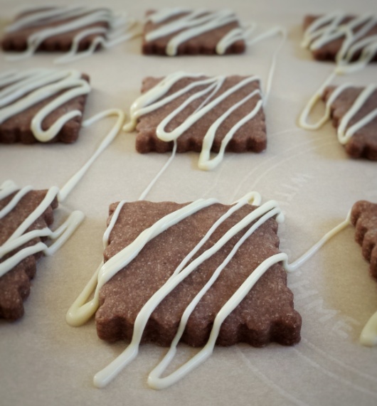 I love recipes that can be used in many ways. Sweet pastry is definitely one of them. Once you’ve found a good recipe, there are so many things you can do. Pies, tarts…..and cookies ! This is the same recipe I used for the shell of my Chocolate Pistachio Tart ! But instead of putting them in a tart mold, I cut them into squares and dressed them up with some melted white chocolate ! If you don’t want chocolate cookies, you can easily replace the cocoa powder with flour or even ground almond !